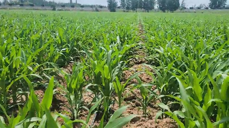 今年山東奧龍按照菏澤魯西新區(qū)農(nóng)戶要求,研發(fā)生產(chǎn)了一款高產(chǎn)新模式玉米播種機(jī)。該機(jī)采用大小行配置、每穴雙粒,畝株數(shù)7400~8000顆,深施玉米專用緩釋肥,小行中間鋪滴灌帶。目前,玉米長(zhǎng)勢(shì)良好。